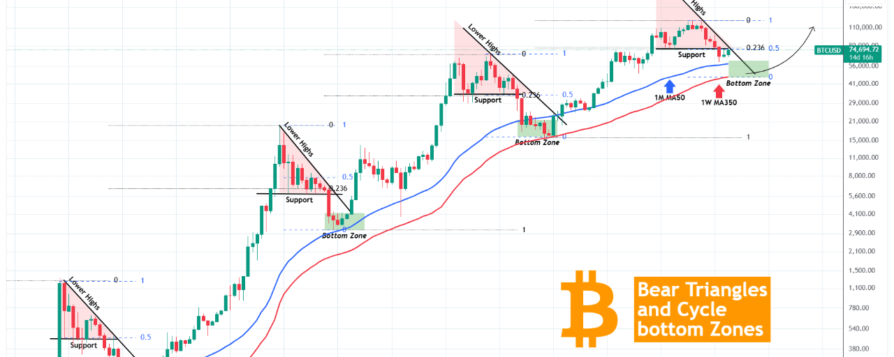 En los Ciclos del Oso de 2014 y 2018, el fondo llegó en el 1M MA50 (línea de tendencia azul). En el más reciente (2022) se formó dentro de la Zona 1M MA50 - 1W MA350 (línea de tendencia roja). Aquí es donde esperamos que BTC forme su nuevo fondo (mínimo), dentro de $50000 - 45000.