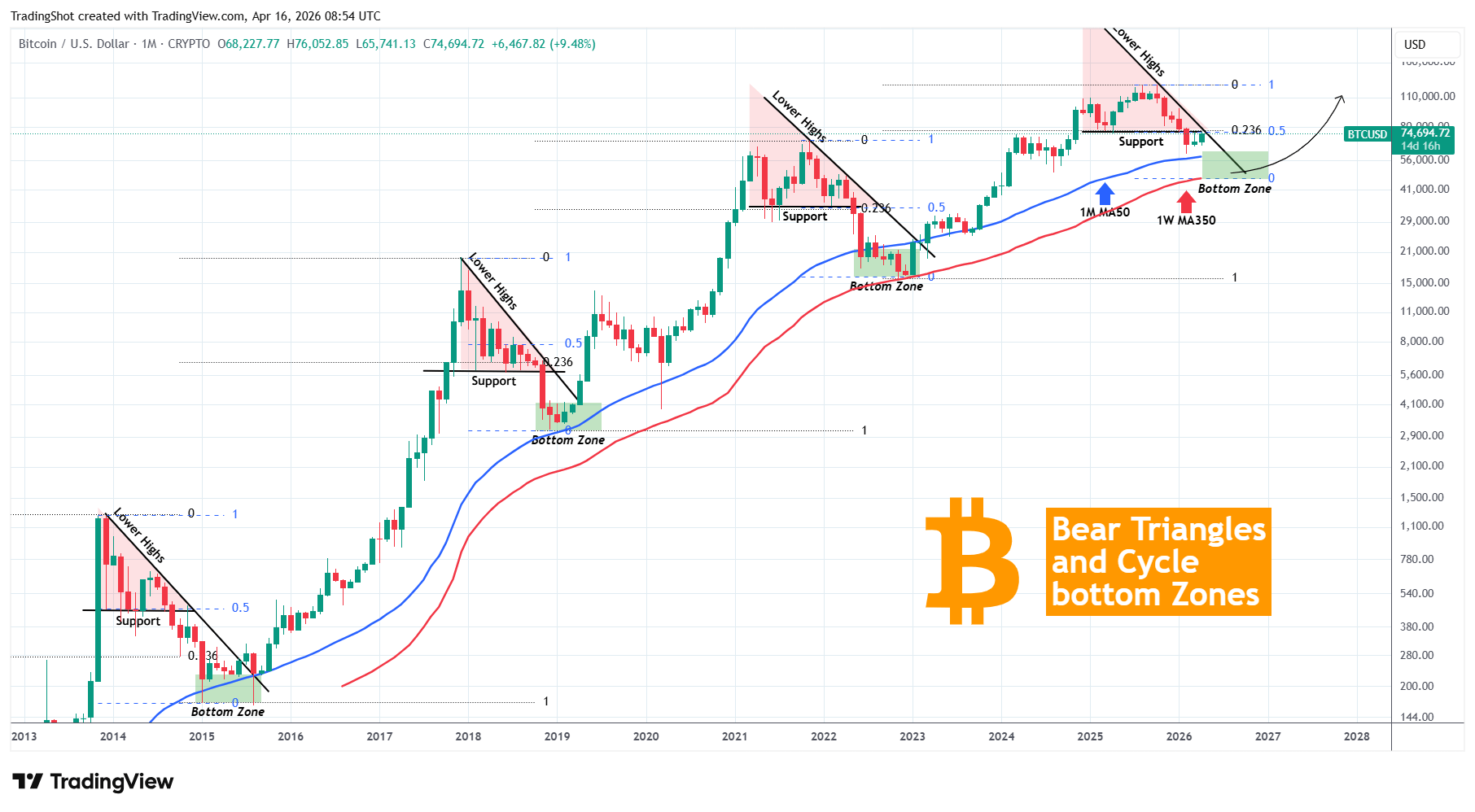 Nota también que el Soporte del Triángulo ha estado históricamente en el nivel de retroceso de Fibonacci de 0.236 desde el Bajo del Ciclo anterior o en el 0.5 Fib (azul) desde el próximo mínimo. Si esto está nuevamente en el MA350 de 1W, entonces esta vez los 0.236 y 0.5 Fibs se superponen, lo que confirma en gran medida esta tesis del Triángulo.