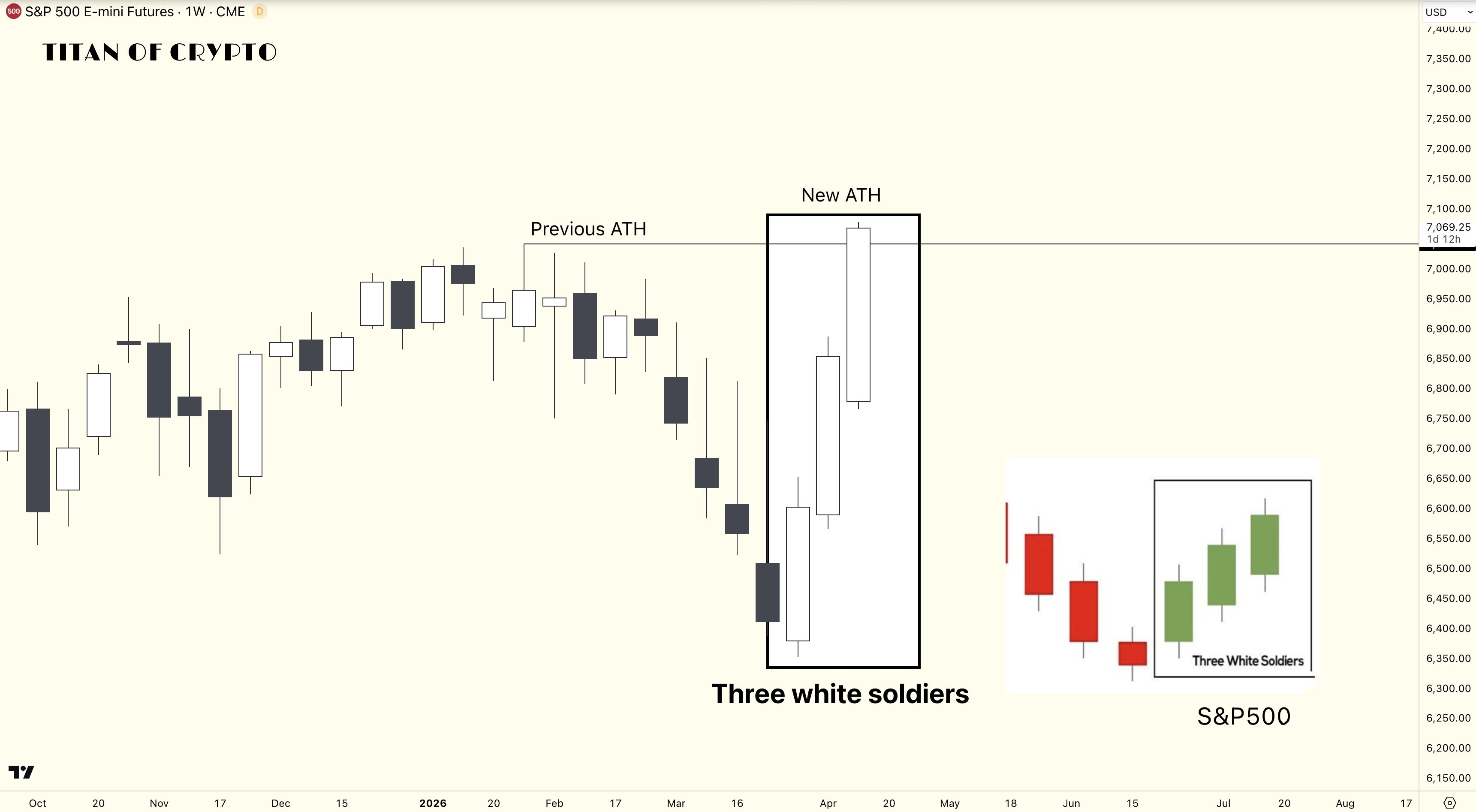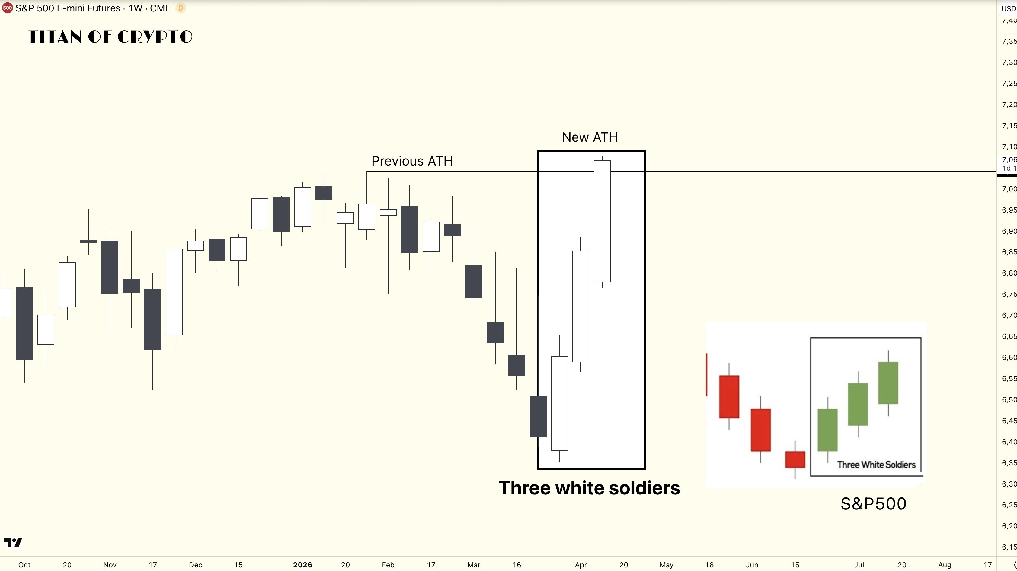 En el gráfico semanal del índice S&P 500, se forma una de las señales técnicas más claras y poderosas: el patrón de los tres soldados blancos. Tres velas alcistas consecutivas, cada una cerrando por encima de la anterior, en el contexto de una ruptura clara de niveles históricos, no es solo una coincidencia visual, sino un mensaje compuesto del mercado.
