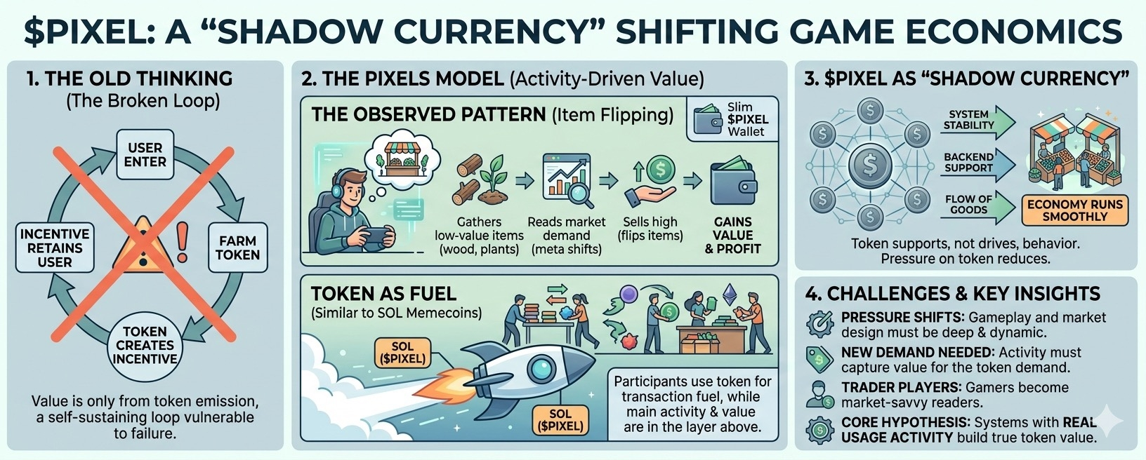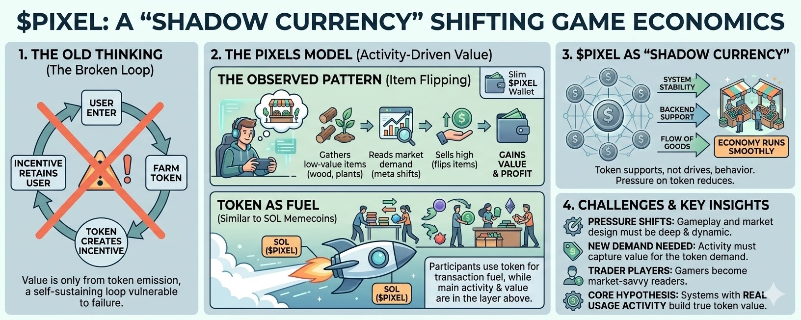 Trong lúc đọc kỹ hơn, mình bắt đầu nhìn PIXEL như một dạng “shadow currency”. Nó không biến mất, nhưng cũng không đứng ở trung tâm. Nó giống một lớp nền đảm bảo hệ thống vận hành, hơn là thứ người chơi tối ưu trực tiếp.