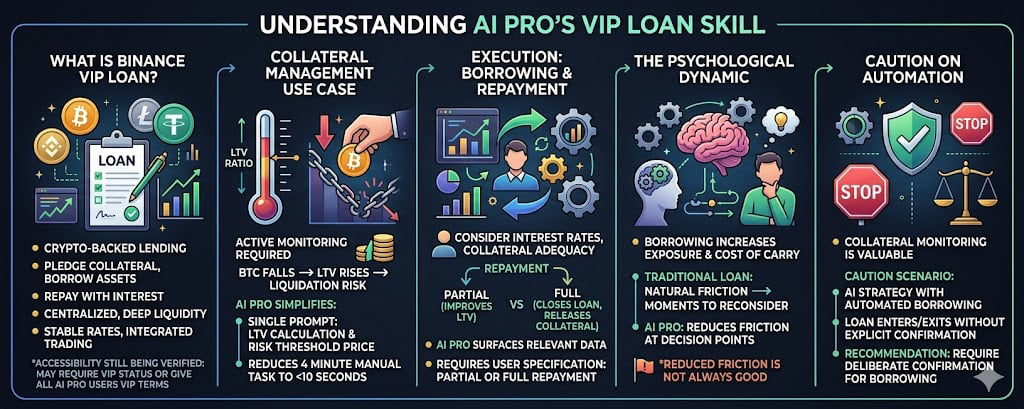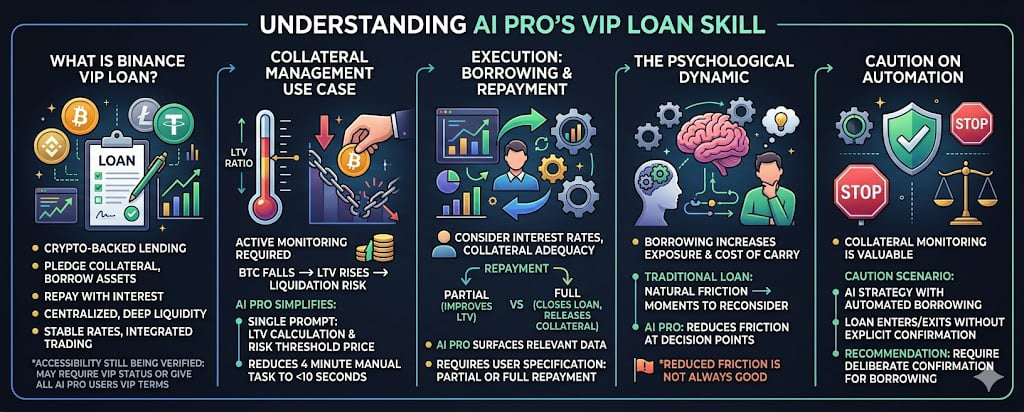 Most crypto traders know Binance has a lending product. Few have used the VIP Loan service specifically, because until recently it required being in Binance's VIP program — a tier that most users don't reach through standard trading volume thresholds. The VIP Loan skill in the AI Pro ecosystem connects agents to Binance's institutional lending desk: query loan terms, manage collateral, and execute borrowing and repayment flows.