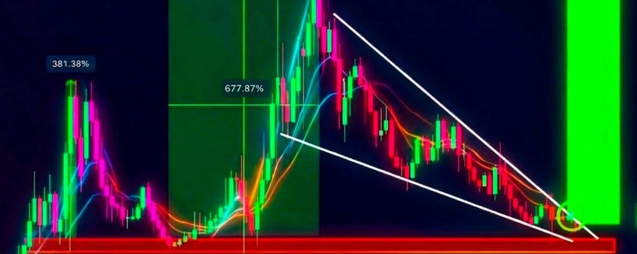 Después de meses de tendencia a la baja dentro de un cuña descendente, el precio ahora se está comprimendo en la parte inferior, mostrando signos de un posible breakout. Este patrón ha llevado históricamente a movimientos masivos al alza una vez que el impulso cambia.