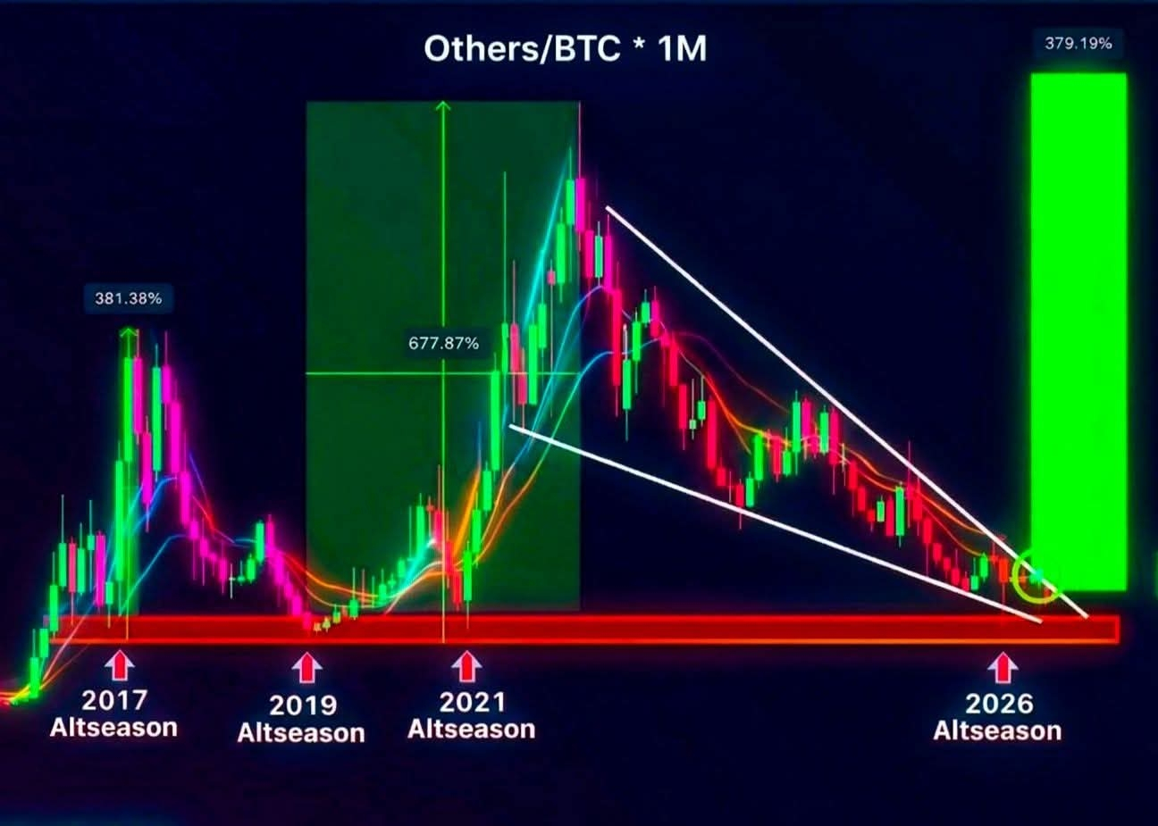 En este momento, el gráfico de Others/BTC (1M) está en una zona de soporte a largo plazo — la misma área donde nacieron las anteriores altseason en 2017, 2019 y 2021. 📉➡️📈