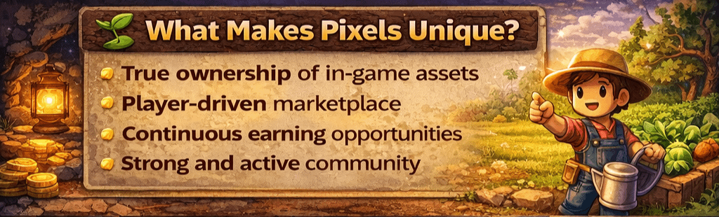 At its core, Pixels combines farming simulation mechanics with blockchain ownership. Players are not just participants — they are contributors to a growing digital economy.