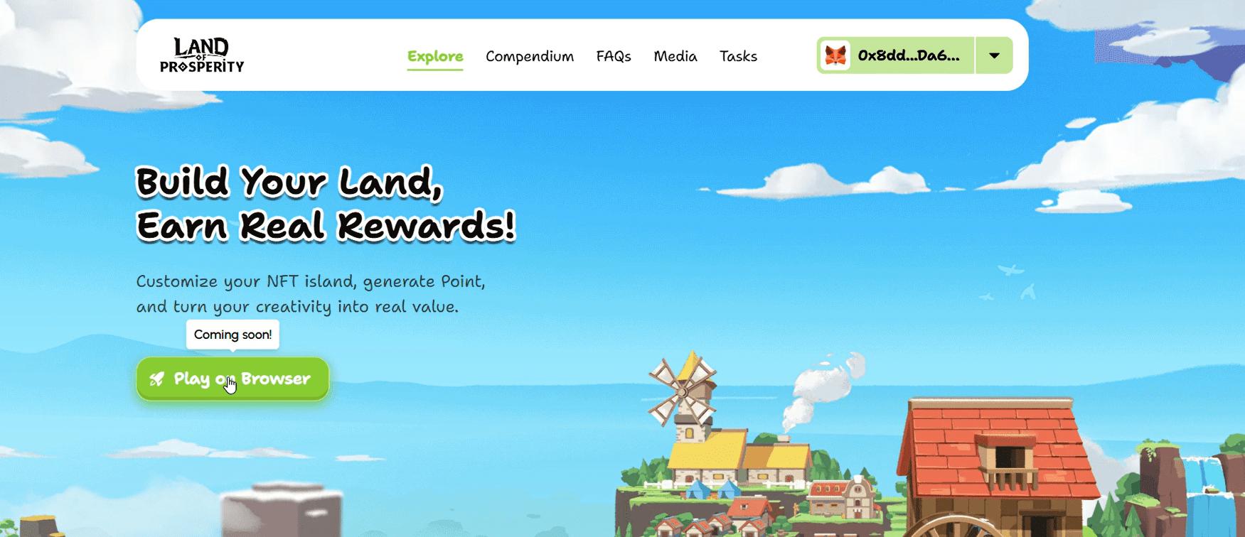 Hasta ahora, Land of Prosperity no se ha lanzado oficialmente. El proyecto aún está en su etapa de pre-lanzamiento/acceso anticipado, con el portal mostrando secciones de “próximamente” y marcadores para acuñación y juego.