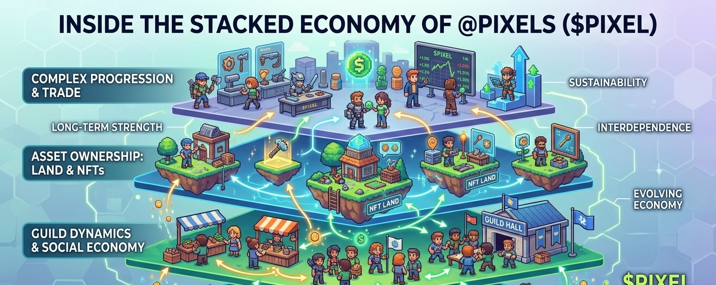 Lo que hace que $PIXEL sea interesante no es solo su utilidad como token de recompensa, sino cómo está entrelazado en un ecosistema en capas, “apilado”. Cada pequeña acción, ya sea crear, comerciar o interactuar socialmente, alimenta un sistema más amplio que no depende de la gratificación instantánea. En cambio, distribuye valor a través de múltiples capas como NFT, propiedad de tierras, dinámicas de gremios y sistemas de progresión.