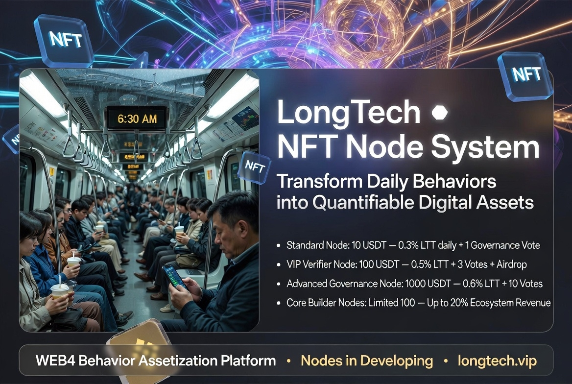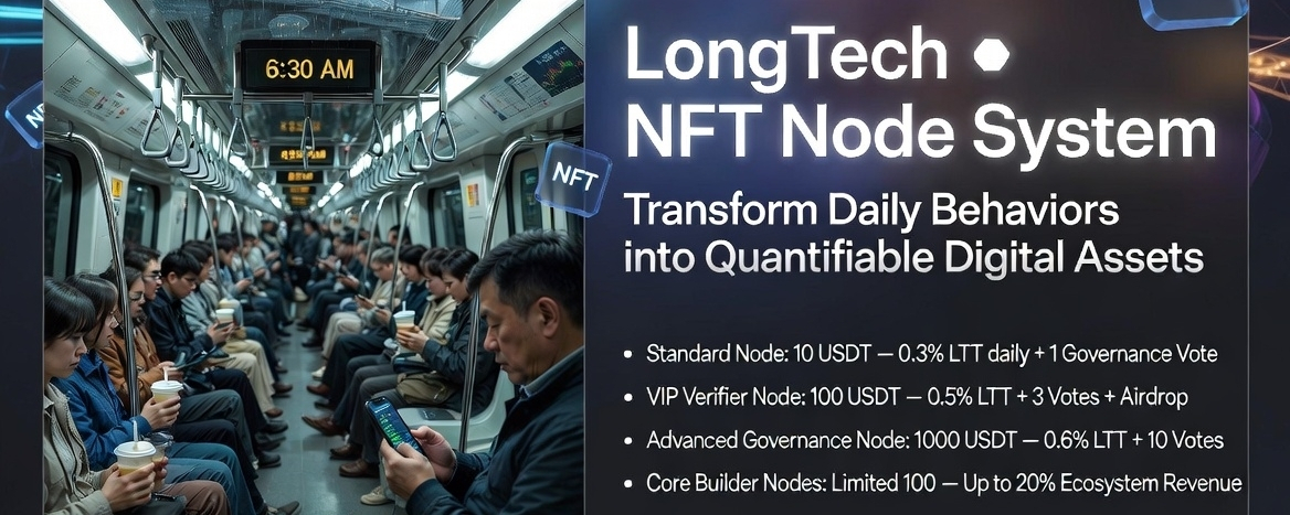 我把这惯性抽出来一看,发现它跟LongTech里NFT节点系统的运作逻辑其实挺像的。节点不是一次性买卖,而是把持有者的日常参与转化成持续的权益分配,目前官网显示节点购买功能还标着Developing,不过不同等级的节点已经规划清楚了。标准接入节点10 USDT起,每天能拿到0.3% LTT奖励加1票治理权,我上次在币安广场刷到推广帖时就想,这跟以前我参与过的其他项目节点比,透明度确实更高,因为它强调自动化NFT权益分配,而且是可验证的。VIP验证者节点100 USDT,0.5%奖励加3票,还带空投资格,高级治理节点1000 USDT则0.6%加10票,我觉得这套分级设计挺务实的,它让普通用户也能低门槛进来,但核心建造者节点限量100个,最高能分20%生态收入,我观察到目前整个节点总供应量规划到几十万,但实际购买还没完全开放,治理权听起来诱人,不过要等DeFi和PWA系统上线后才能真正落地。