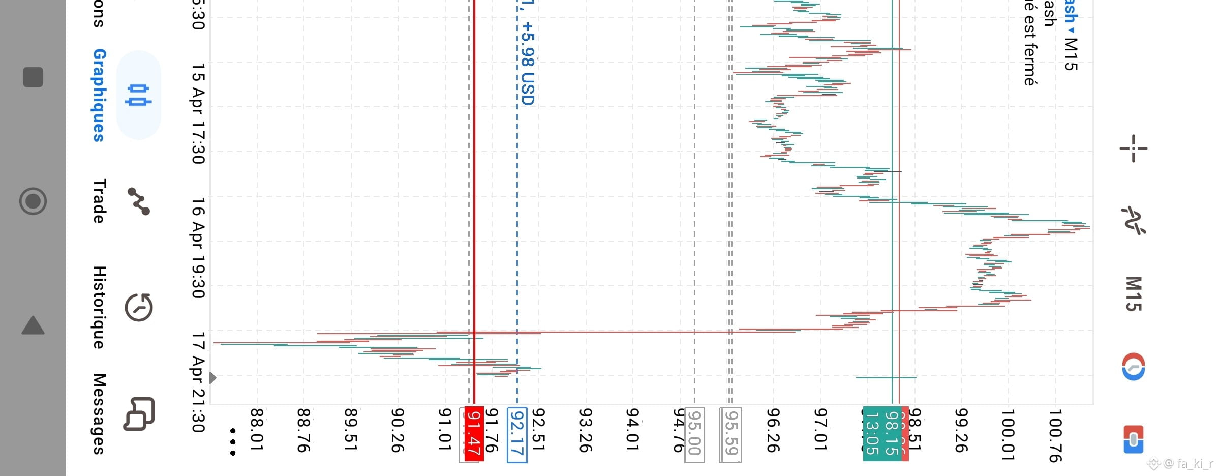 بعد الهبوط العنيف اللي شفناه وصل فيه السعر لمناطق 88.00$، كان كيبان بلي السوق وصل لمرحلة "التشبع البيعي". انتظرت علامات الارتداد ودخلت صفقة شراء (Buy) عند مستوى 92.17.