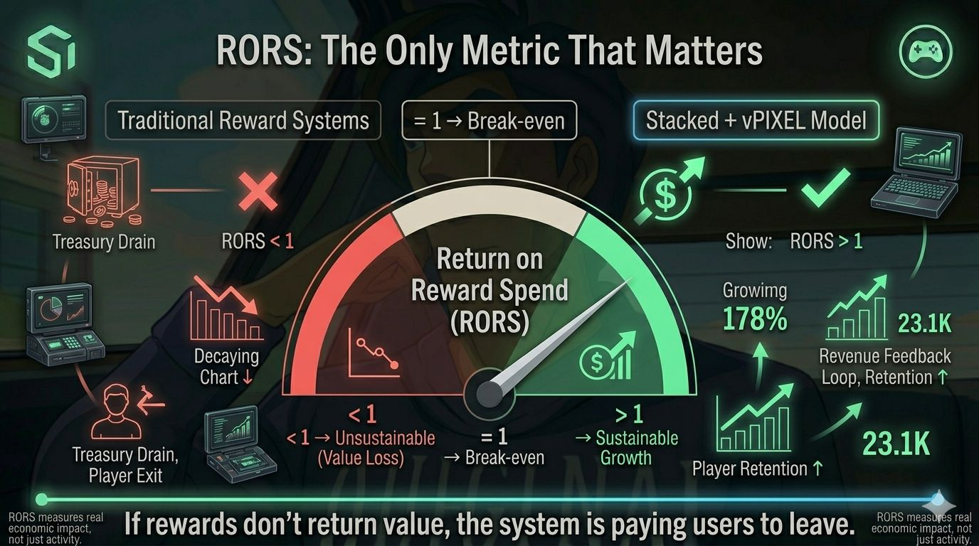 Stacked extiende esta lógica a la capa de segmentación. Donde vPIXEL maneja el lado del retiro de la economía, Stacked maneja el lado de la distribución de recompensas. El antiguo modelo distribuía recompensas basadas en la actividad, lo que significaba que cualquier jugador que apareciera y completara tareas podría capturar emisiones independientemente de si contribuía a la salud del ecosistema o extraía de él. Stacked reemplaza ese enfoque general con un motor de segmentación impulsado por IA que evalúa el comportamiento de los jugadores y despliega incentivos personalizados hacia los jugadores más propensos a convertir esa recompensa en gasto, retención y contribución al ecosistema. La métrica RORS, Retorno sobre el Gasto de Recompensas, es cómo Pixels mide si esto está funcionando. Cada token distribuido como recompensa se supone que debe generar al menos un dólar de regreso en ingresos del ecosistema. Ese es un estándar exigente y el hecho de que Pixels se haya comprometido públicamente a ello significa que el equipo tiene que mantener el número honesto.