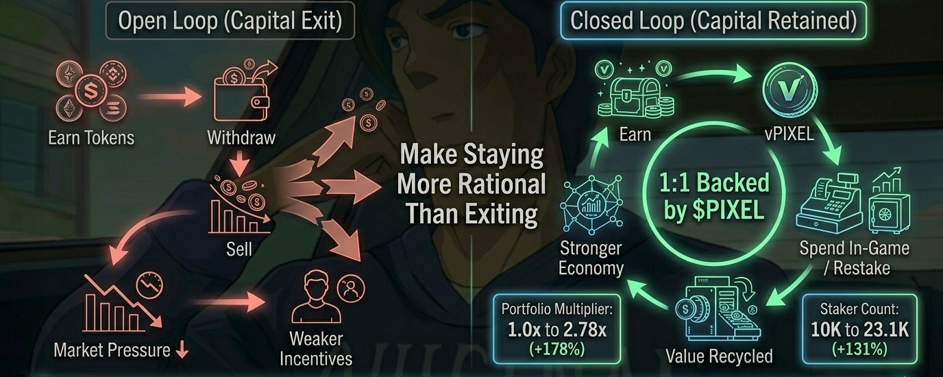 Cuando un jugador gasta vPIXEL dentro del juego, el respaldo $PIXEL no desaparece. Se recicla en recompensas de adquisición de usuarios o en operaciones del tesoro. Eso significa que cada compra dentro del juego hecha con vPIXEL es simultáneamente una parte de los ingresos del ecosistema y un mecanismo para mantener $PIXEL fuera del mercado abierto. El jugador obtiene lo que quería. El ecosistema obtiene el gasto que necesitaba. Y la oferta de tokens que habría llegado a los libros de órdenes de intercambio se queda dentro del sistema haciendo un trabajo útil en su lugar. Ese es un ciclo cerrado en lugar de una fuga, y construir ciclos cerrados es lo más difícil e importante que cualquier economía basada en tokens puede hacer.