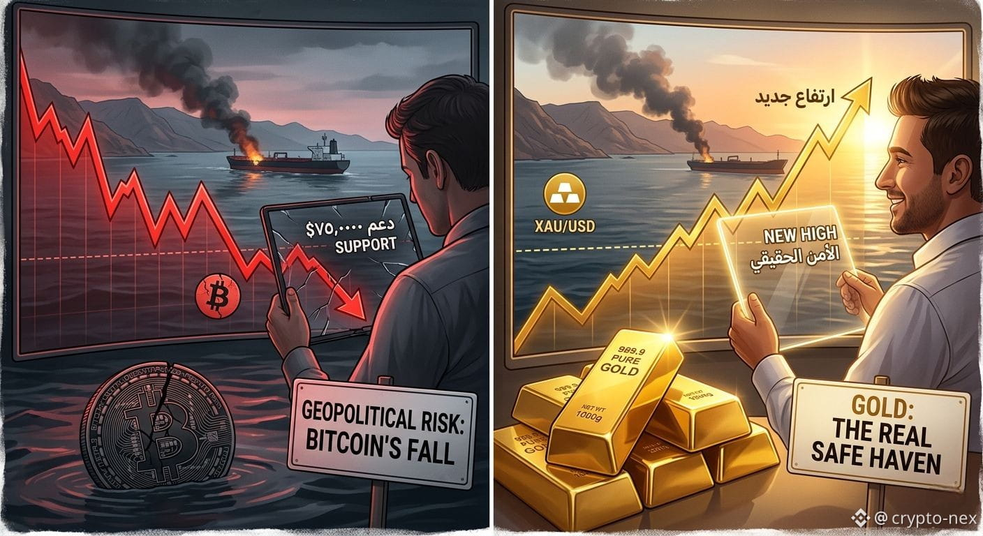 لطالما تغنى مجتمع الكريبتو بأن البيتكوين هو الملاذ الآمن والتحوط الأمثل ضد انهيار الأنظمة المالية، ولكن الساعات الـ 8 الأخيرة وضعت هذه النظرية أمام اختبار قاصٍ. مع تصاعد التوترات العسكرية في مضيق هرمز، شهدنا تحولاً دراماتيكياً في سلوك المستثمرين؛ حيث تحركت السيولة من "الأصول الرقمية" إلى "الذهب الفعلي" و"الدولار".