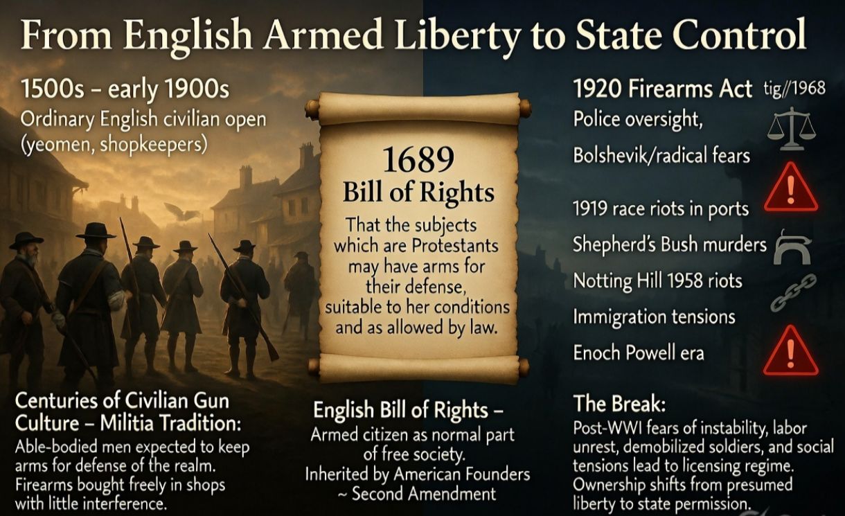 Durante siglos, la ley y la costumbre inglesa trataron al ciudadano armado como una parte normal de una sociedad libre. La Declaración de Derechos de 1689, promulgada tras la Revolución Gloriosa, declaró que los súbditos protestantes podían tener armas para su defensa, adecuadas a su condición y según lo permitido por la ley. Ese lenguaje reflejaba suposiciones inglesas más antiguas en lugar de crear algo completamente nuevo.