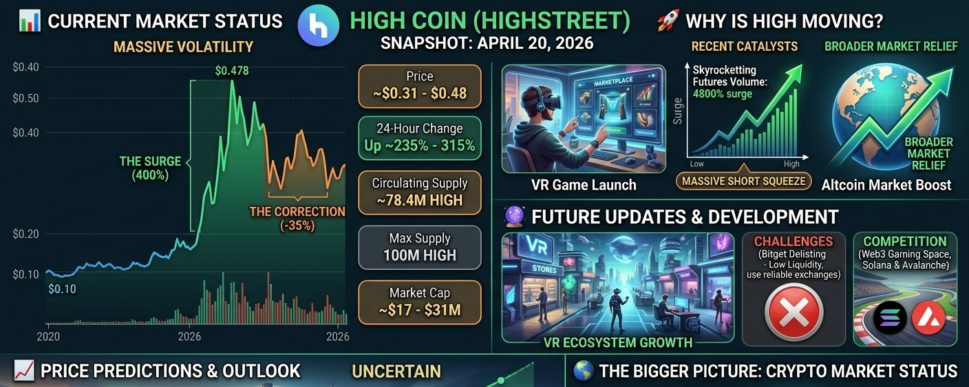 Here's a breakdown of everything happening with HIGH Coin (Highstreet) as of April 20, 2026: