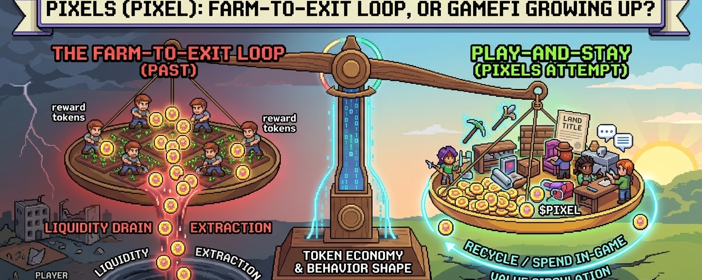 A distancia, Pixels se ve peligrosamente familiar. Un mundo suave y pixelado, un ciclo agrícola amigable, un token superpuesto—esta es la estética y estructura exactas que han quemado silenciosamente múltiples ciclos de GameFi ya. El patrón es casi predecible ahora: la atención inunda, las recompensas atraen a los usuarios a ciclos repetitivos, los tokens se cultivan agresivamente, la liquidez se agota, y lo que queda es un mapa tranquilo con menos jugadores que promesas. Así que es difícil no acercarse a algo como Pixels con un poco de resistencia incorporada.