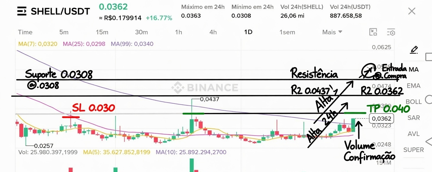 Candle diário de +16,77% no SHELL/USDT com preço agora acima de todas as médias móveis (MA7, MA25 e MA99) e volume sustentando o movimento de reversão após longa tendência de baixa.