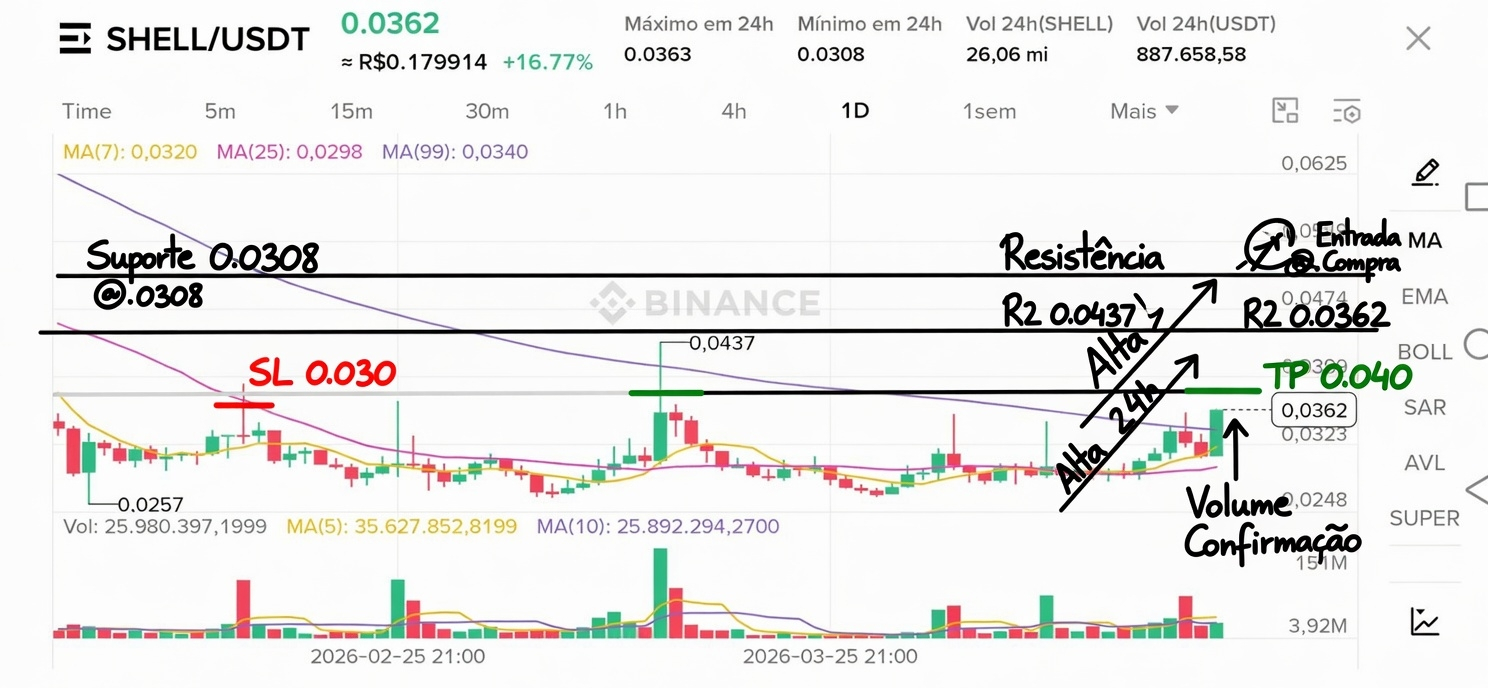 Estrutura clara: fundo formado em 0,0257, preço rompendo a consolidação recente e confirmando momentum comprador. Suporte imediato em 0,0308. Resistências em 0,0363 (máx 24h) e 0,0437 (topo anterior).