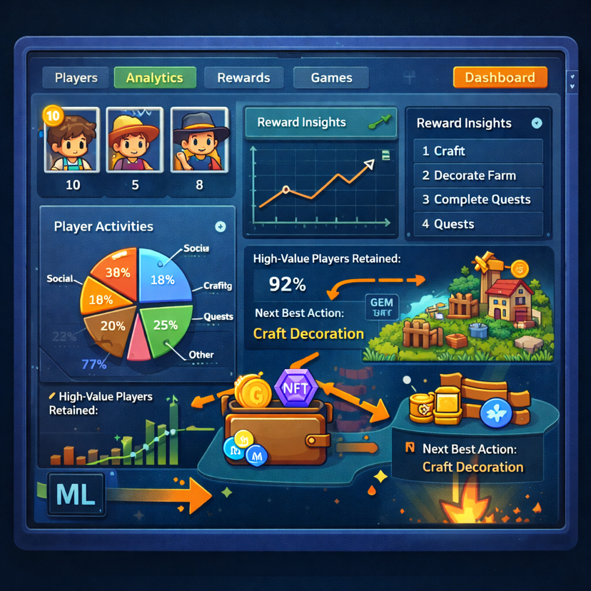 Pixels introduce un sistema de recompensas altamente sofisticado impulsado por análisis de datos y aprendizaje automático.