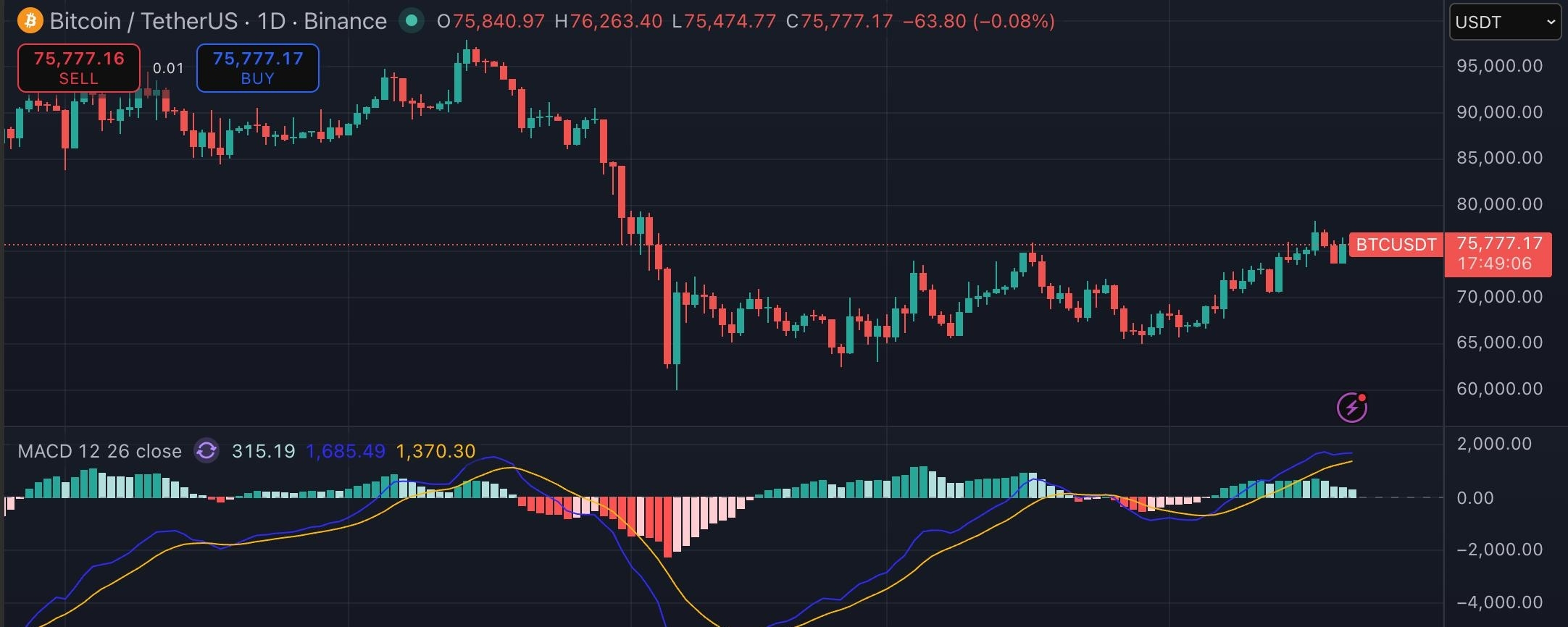 El precio actualmente es de $75,777. Después de una corrección profunda en febrero (en la zona de $60k-$65k), el activo ha formado una tendencia alcista sostenida. Ahora estamos observando una consolidación cerca de los máximos históricos.