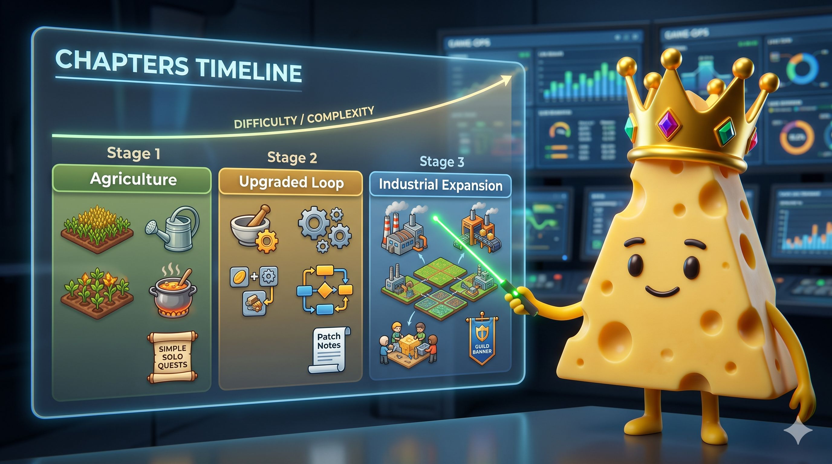 真正的 Pixels,比較像一款分成好幾季的影集——官方用不同章節(Chapter),一路把你從爽爽農場推進到工業合作。
