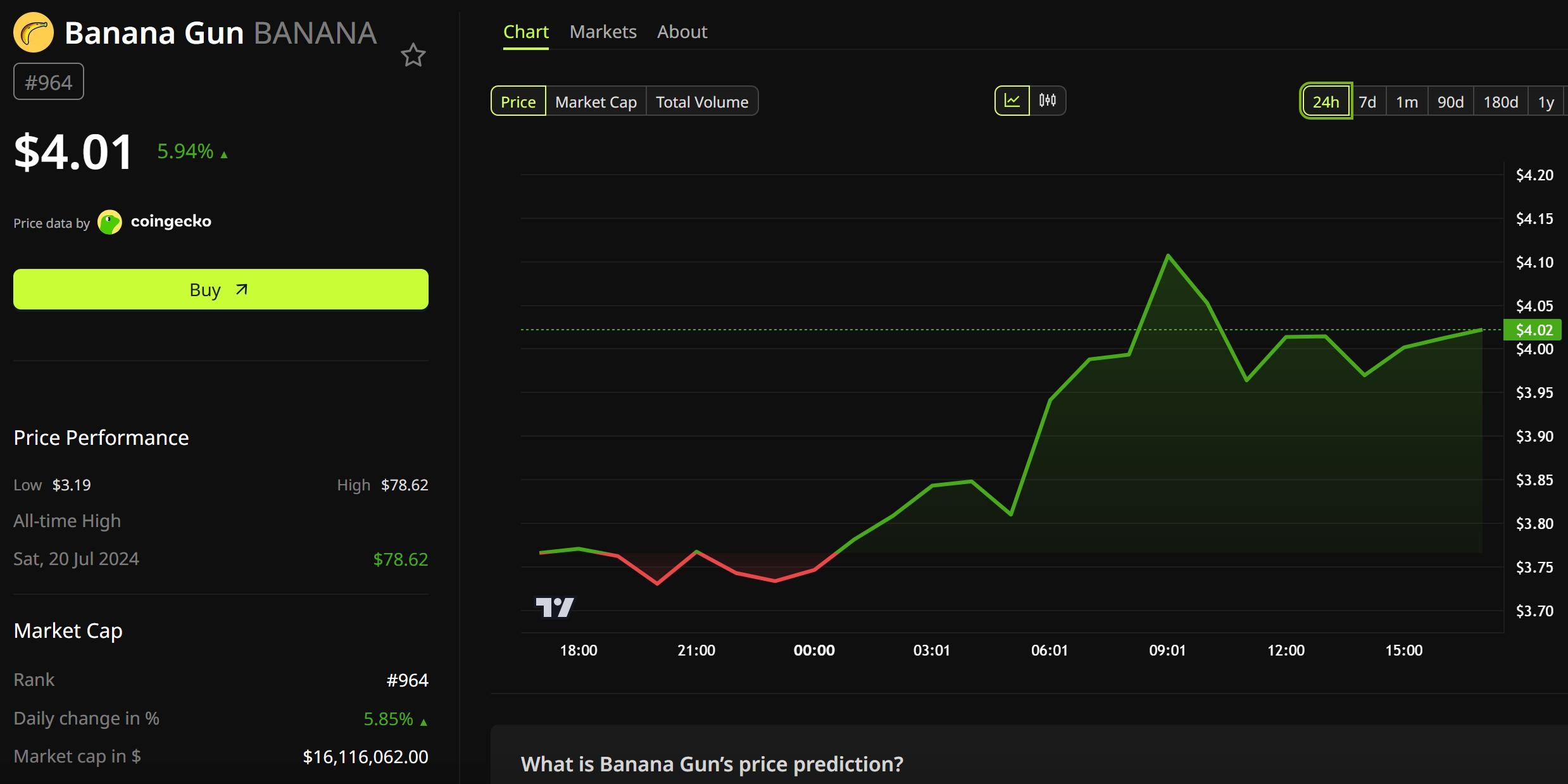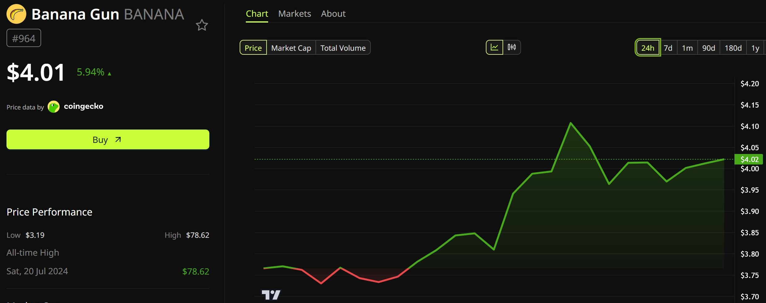 Eric Trump destacó la compra de la obra de arte del plátano de Sun por US$6,2 millones, que según él es más absurdo que la propia demanda. El precio de Banana Gun (BANANA) subió casi un 6% gracias a esta noticia, alcanzando US$4,01 en el momento de la publicación.#bananagun