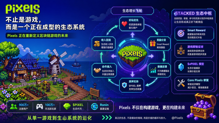 所以我现在再看 Pixels,不会只把它看成一款游戏,也不会只把它看成一个代币故事。我更愿意把它理解成一个正在形成中的链上增长系统。它的价值不只在于今天有没有热度,而在于它是否在重新定义区块链项目该如何理解生态:不是把用户吸进来就结束,而是让用户、内容、数据、奖励、质押和游戏之间形成持续共振。只有当这些环节真的连起来,生态二字才算名副其实。