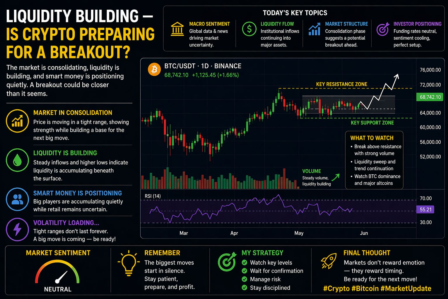El mercado cripto está entrando en una fase donde el silencio habla más que el ruido. Bitcoin$BTC se mantiene firme, mientras la liquidez sigue construyéndose bajo la superficie — una señal clásica de que algo más grande puede estar en el horizonte.