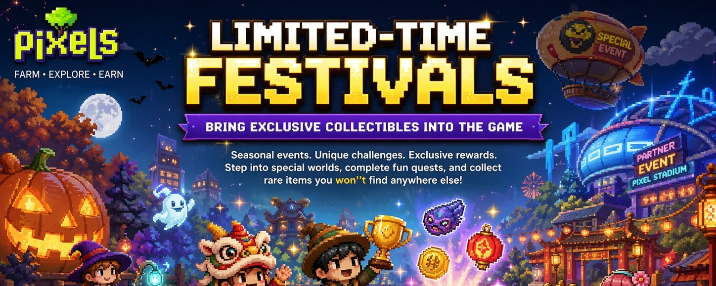I see Pixels’ limited-time festivals as more than simple seasonal updates. They’re one of the clearest ways the game keeps its world active, emotional, and worth returning to. When I look at how Pixels uses these events, I notice that the team isn’t only adding temporary decorations or short quests. They’re creating moments that players can actually remember. A normal farming game can become repetitive when the same crops, resources, and tasks continue for too long, but festivals interrupt that routine. They give players a fresh reason to log in, explore, talk with others, complete tasks, and collect items that may not return in the same way again.