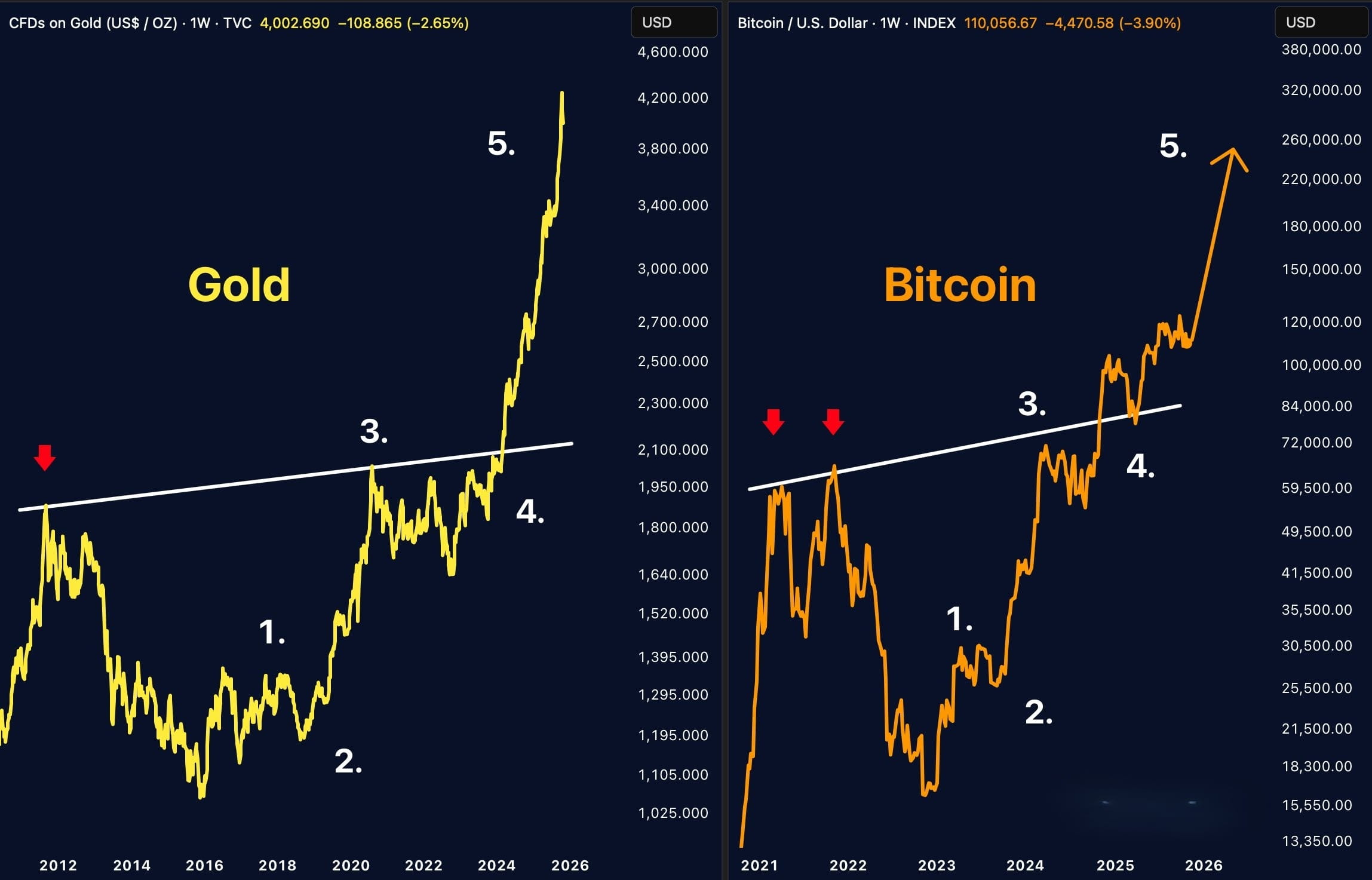 El oro acaba de completar un rally de onda parabólica 5 después de romper un techo de resistencia de una década, subiendo a $4,002 por onza. Bitcoin, que actualmente se cotiza a $110,056 después de una corrección del 3.90%, está mostrando una estructura de cinco ondas inquietantemente similar en su gráfico semanal. Si la historia no solo rima sino que se repite, podríamos estar presenciando la preparación para el movimiento más explosivo de Bitcoin hasta ahora.