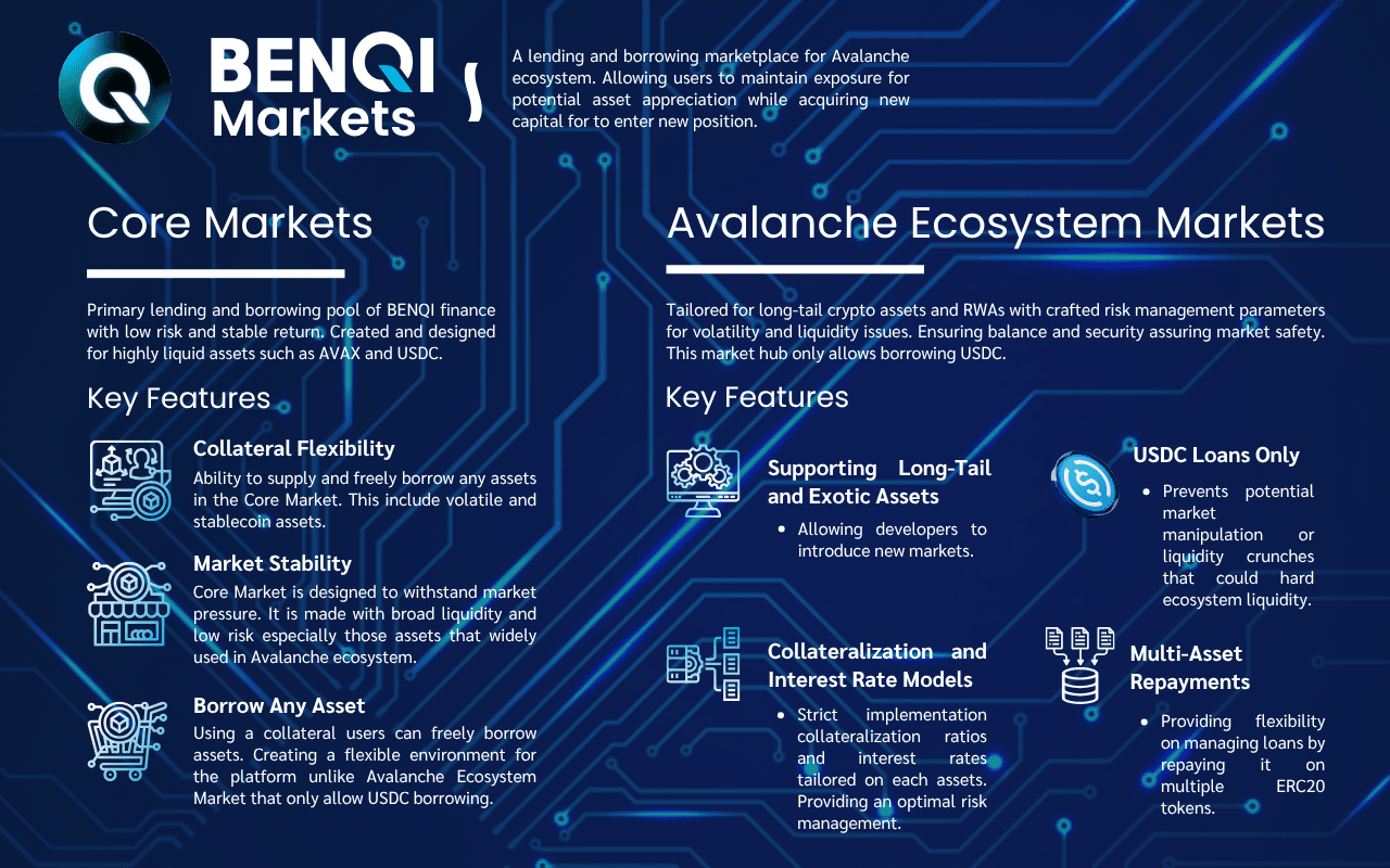 Hay dos mercados principales en la financiación de BENQI, a saber, el Mercado Central y el Mercado del Ecosistema Avalanche. Ambos mercados tienen su propio conjunto de reglas para el préstamo y la toma de préstamos, para mitigar el riesgo y el potencial colapso del mercado.