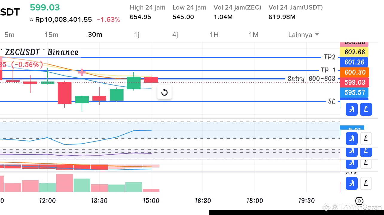 - Actualmente enfócate en la zona 600 como fuerte resistencia a corto plazo. Ruptura alcista por encima de 600 con volumen aumenta las oportunidades de rally a 604-606 o más alto.
