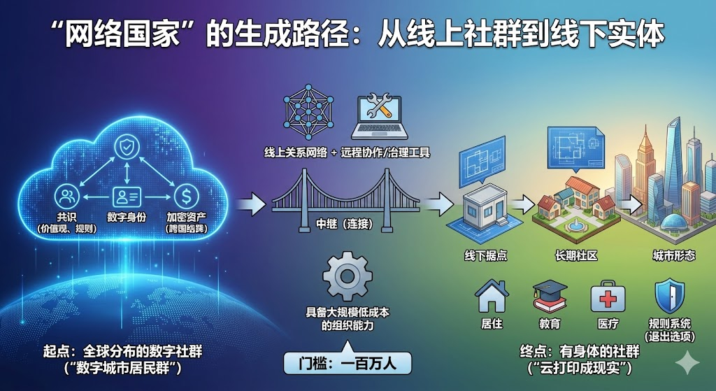 El llamado estado en red puede entenderse primero con una frase sencilla: una comunidad en línea que gradualmente posee entidades físicas fuera de línea, y finalmente tiene una capacidad organizativa similar a un estado.