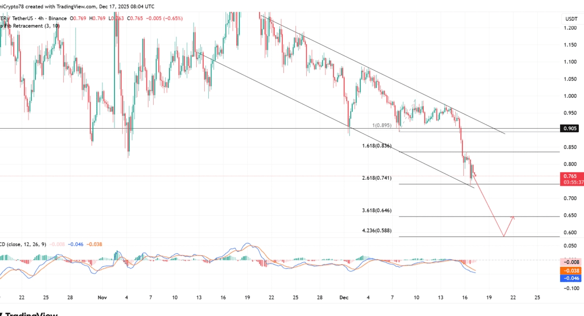 El precio se negoció cerca de $0.76 en el momento de la publicación, situado por debajo del 1.618 Fib en $0.836. Los vendedores ahora pueden centrarse en los objetivos más profundos en $0.741, $0.646 y $0.588.