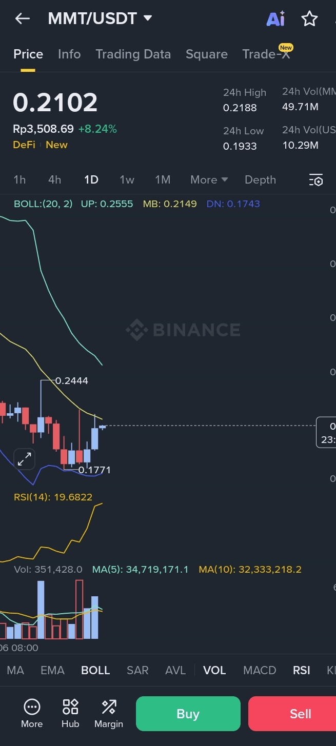 MMT/USDT actualmente muestra signos tempranos de un rebote técnico después de experimentar una fase bajista prolongada. En el momento de la observación, el precio se cotiza alrededor de 0.2102 USDT, registrando una ganancia intradía de más del 8%, lo que sugiere un interés de compra a corto plazo que surge después de un fuerte retroceso. Este movimiento parece ser una reacción desde un fondo local más que una reversión de tendencia confirmada.