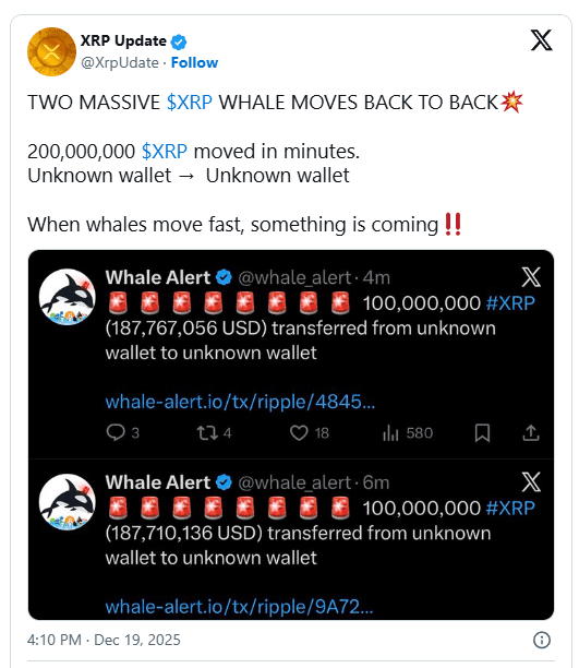 Ambas transacciones mostraron la transferencia de fondos de una billetera desconocida a otra. Esta falta de claridad rápidamente generó especulaciones, especialmente con el XRP cotizando por debajo de 2 dólares. Rara vez los grandes jugadores mueven tanto capital sin razón. Los mercados tienden a notar esto cuando sucede, y XRP Update ve esto como una señal notable.