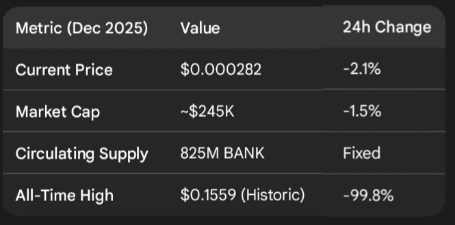 Acción del Precio: A partir del 23 de diciembre de 2025, BANK se está negociando cerca de $0.00028, luchando por recuperar el nivel de $0.00035 que sirvió como punto de pivote anteriormente en el trimestre.