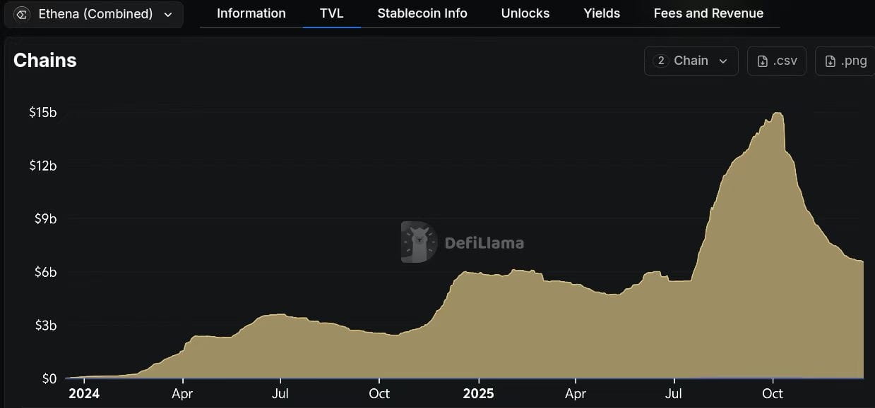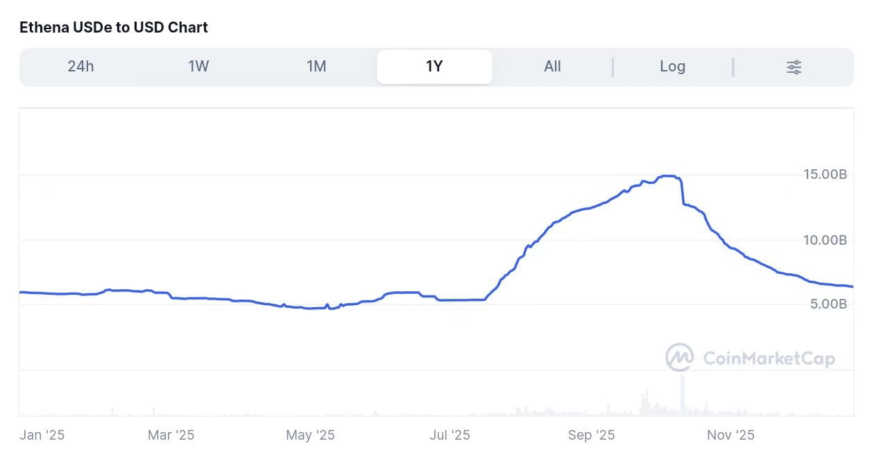 Desde el “shock del mercado 10/11”, la stablecoin sintética de Ethena, USDe, ha visto cómo su capitalización de mercado se reduce casi a la mitad, con salidas netas de aproximadamente $8.3 mil millones. Según CoinMarketCap, la capitalización de mercado de USDe estaba cerca de $14.7 mil millones a partir del 9 de octubre, pero disminuyó a alrededor de $6.4 mil millones en poco más de dos meses.