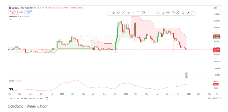 Al observar el gráfico semanal de TradingView, la tendencia actual presenta un notable sentimiento bajista. El indicador Supertrend sugiere una perspectiva bajista, ya que el precio está por debajo de la línea de tendencia roja situada en $0.70751.