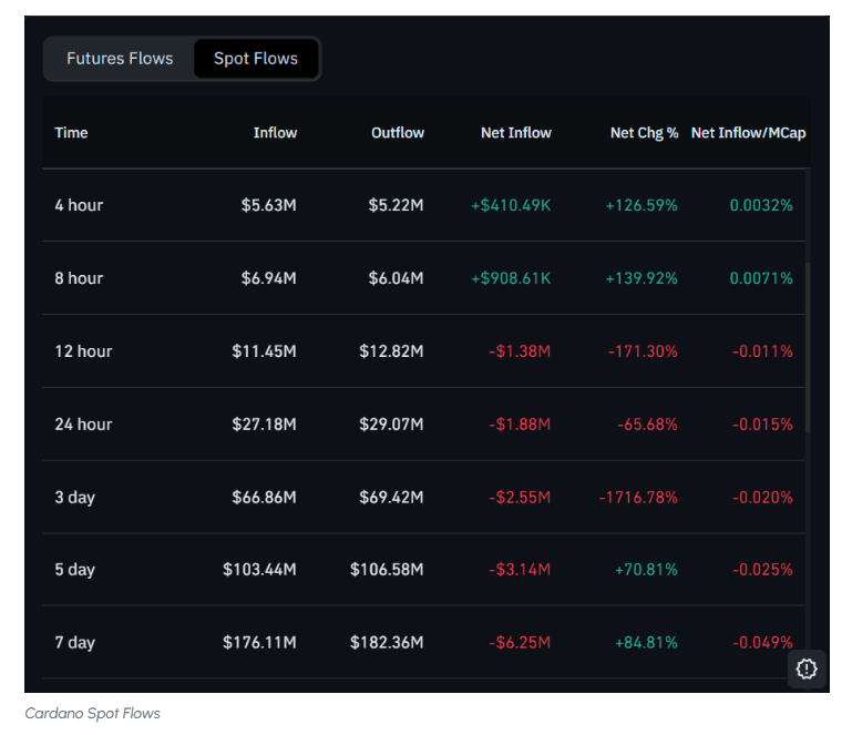 En otros lugares, según los datos de Coinglass, ADA ha visto fluctuaciones significativas en sus flujos spot durante la última semana. Los flujos spot de 4 horas muestran una entrada neta positiva de $410.49K, con un aumento del 126.59% en los flujos.