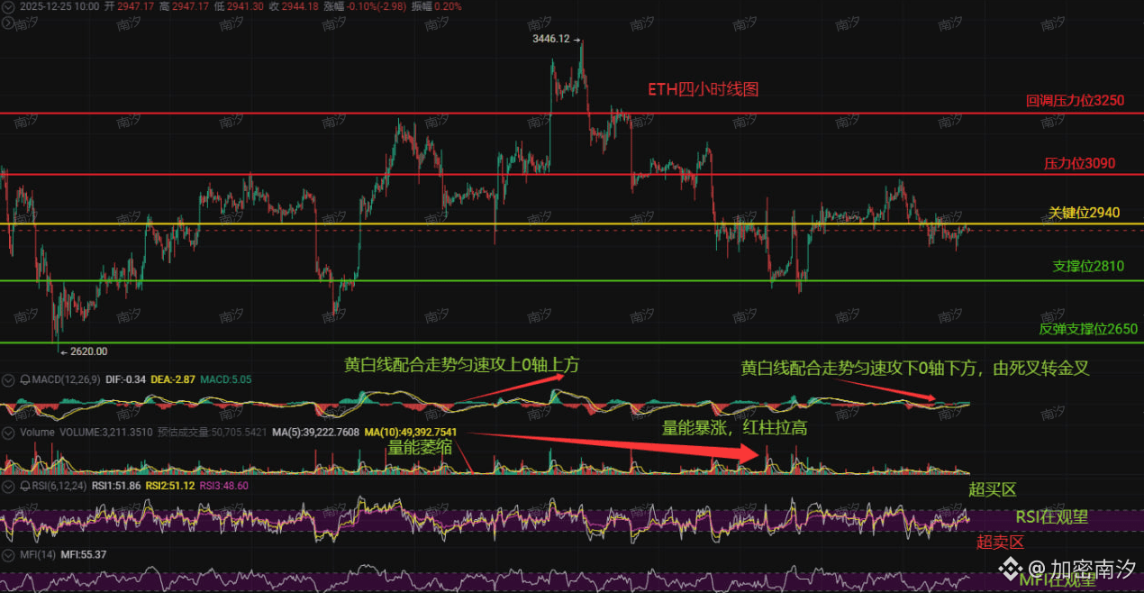 现在ETH像个钟摆,上不去也下不来。关键问题来了:它到底是能一口气冲到3090甚至摸高3250,还是扭头就跌向2810,甚至去考验2650的“老底”? 我告诉你,答案就藏在MACD的黄白线里——它们正“匀着速”往0轴下边走,眼看金叉变死叉。这是个危险的信号,意味着多头力量正在衰退,空头可能正在憋大招。