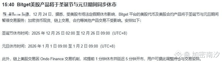Bitget美股产品圣诞节要休市。这意味着什么?主流市场休息,加密货币这个小池塘,大资金玩点花样,波动反而可能被放大! 这种时候,更要警惕突然的插针或者画门行情。