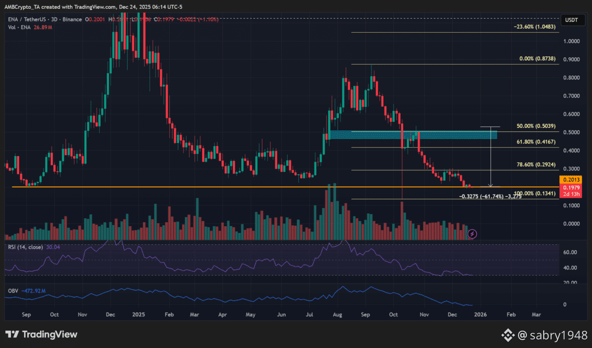 * هبوط حاد: فقدت عملة ENA حوالي 62% من قيمتها في الربع الرابع، حيث انخفضت من مستويات 0.5 دولار إلى ما دون 0.2 دولار.