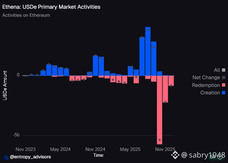 * نزوح جماعي للمستثمرين: شهدت العملة المستقرة USDe (التي تمنح عوائد) عمليات سحب ضخمة؛ ففي شهر أكتوبر وحده، تم استرداد (Redemption) نحو 5.7 مليار دولار.