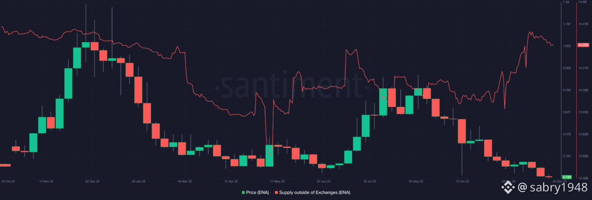 * زيادة الحيازة خارج المنصات: لاحظت البيانات (عبر Santiment) أن كمية عملات ENA الموجودة خارج منصات التداول قد ارتفعت. هذا يشير إلى أن المستثمرين يستغلون الأسعار المنخفضة حالياً لتكديس العملة وتخزينها في محافظ باردة، توقعاً لارتداد السوق مستقبلاً.