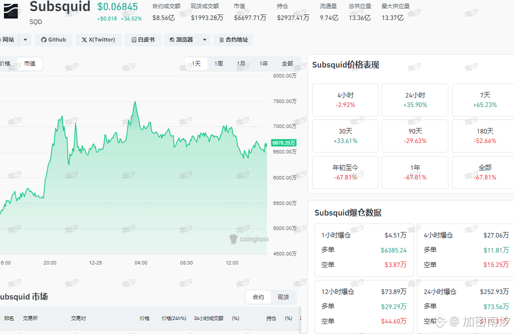 SQD现价 $0.06845,24小时暴涨35.9%,7天更是拉了65%。乍一看,牛回来了?别急,再看90天:-29.63%,年初至今:-67.81%。这说明什么?短期反弹猛如虎,长期趋势还是熊。