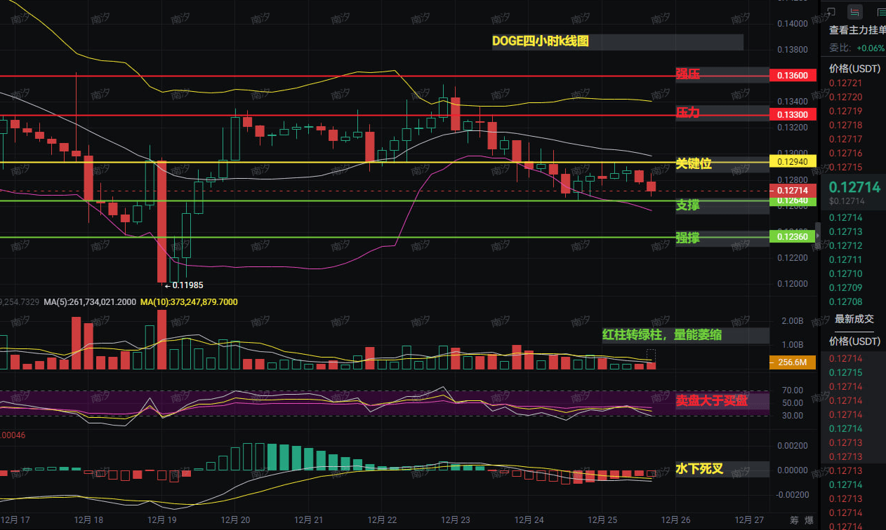 Consejo sólido de Nanxi para los jugadores: el Dogecoin está débil ahora, si estás atrapado, no te resistas. Si tienes una posición pesada, espera a que rebote cerca de 0.13300 para reducir un poco la posición y disminuir el riesgo. Si tienes una posición ligera o estás en corto, solo puedes intentar comprar en la parte baja con dinero disponible, prueba un poco cerca de 0.12640, si baja de 0.12300 debes detener pérdidas.