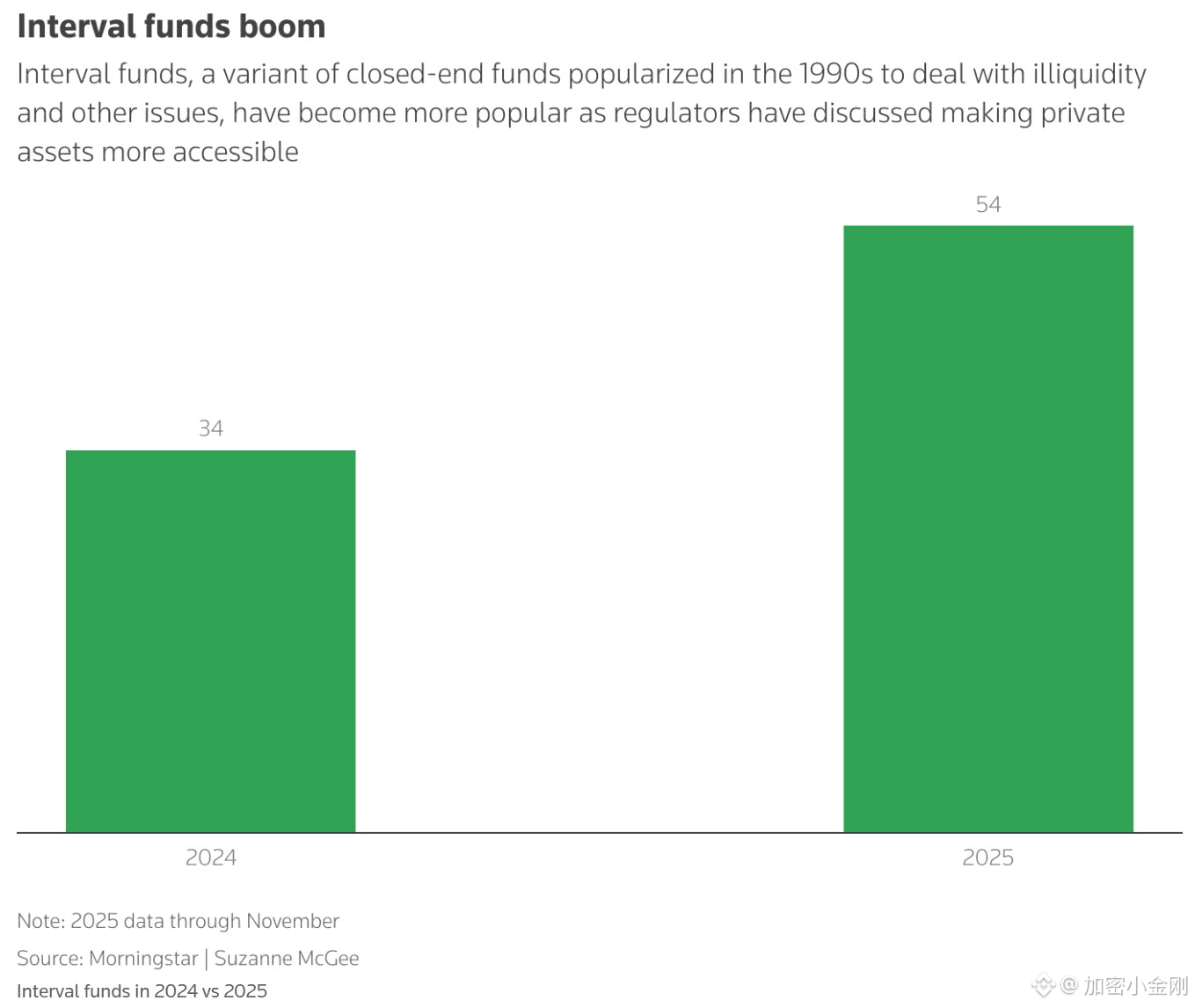 晨星数据显示,加密ETF数量快速增加,Bitwise预测,2026年可能还会新增上百只相关产品。与此同时,更多“间隔基金”(Interval Fund)——一种可以投资私人资产、但流动性有限的基金——也开始受到青睐,被视为“打通散户参与私募市场”的桥梁。
