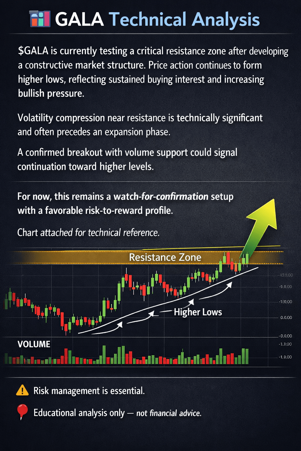 $GALA está mostrando fuertes señales de una ruptura a medida que la acción del precio se ajusta cerca de una zona de resistencia clave. Los compradores están entrando, el volumen está mejorando y la estructura sugiere un posible movimiento al alza si este nivel se supera de manera convincente.