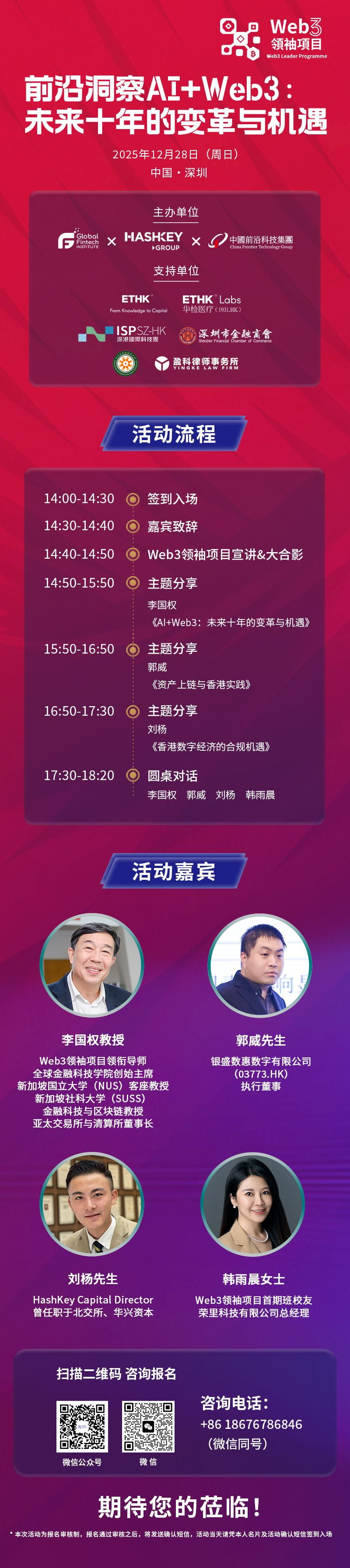 ME News informa que el 26 de diciembre (UTC+8), el foro del proyecto de líderes de Web3 se llevará a cabo el 28 de diciembre (domingo) en Shenzhen. Este foro se centra en las transformaciones y oportunidades de AI+Web3 en la próxima década, con la participación especial del mentor principal del proyecto de líderes de Web3, el profesor Li Guoquan, fundador de la Academia Global de Tecnología Financiera, el director ejecutivo de Yinpan Shuhui, el señor Guo Wei, el director de HashKey Capital, el señor Liu Yang, así como el alumno de la primera clase del proyecto de líderes de Web3 y gerente general de Rongli Technology Co., Ltd., el estudiante Han Yuchen.