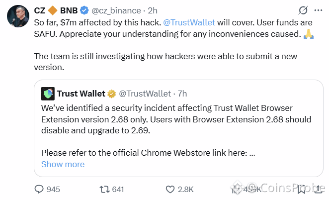 Binance founder CZ (Changpeng Zhao), whose company owns Trust Wallet, publicly stated: "So far, $7m affected by this hack. TrustWallet will cover. User funds are SAFU." This commitment ensures that affected users will be fully reimbursed through Binance's Secure Asset Fund for Users.