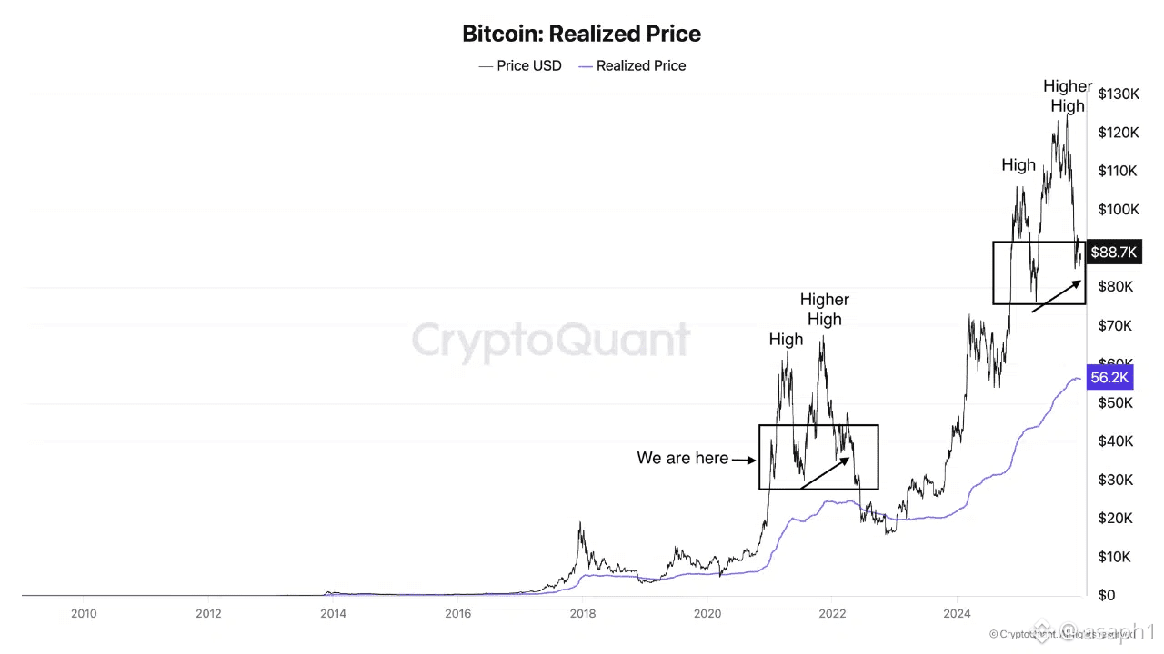 Pero aquí viene lo técnico puesto en fácil: existe algo llamado Precio Realizado, que básicamente es el costo promedio al que todos los que tienen Bitcoin hoy lo compraron. Históricamente, cada vez que BTC alcanza un máximo y empieza a bajar, ese precio realizado actúa como un punto de gravedad. Mira estos puntos clave para que no te agarren fuera de base: